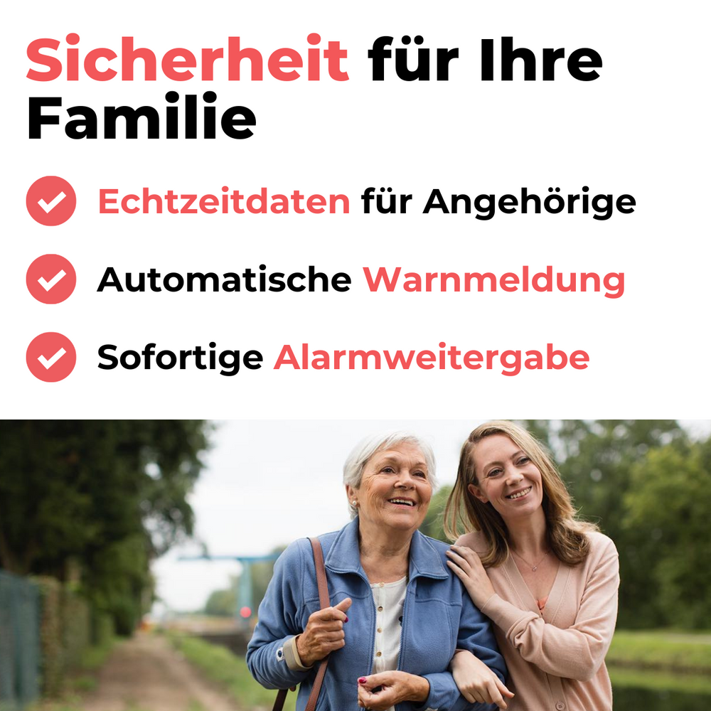 Wenn etwas passiert, zählt jede Sekunde. Die CareSense informiert bis zu drei Angehörige – mit Gesundheitsstatus und Standort. Sie wissen sofort Bescheid, auch wenn Sie nicht vor Ort sind.